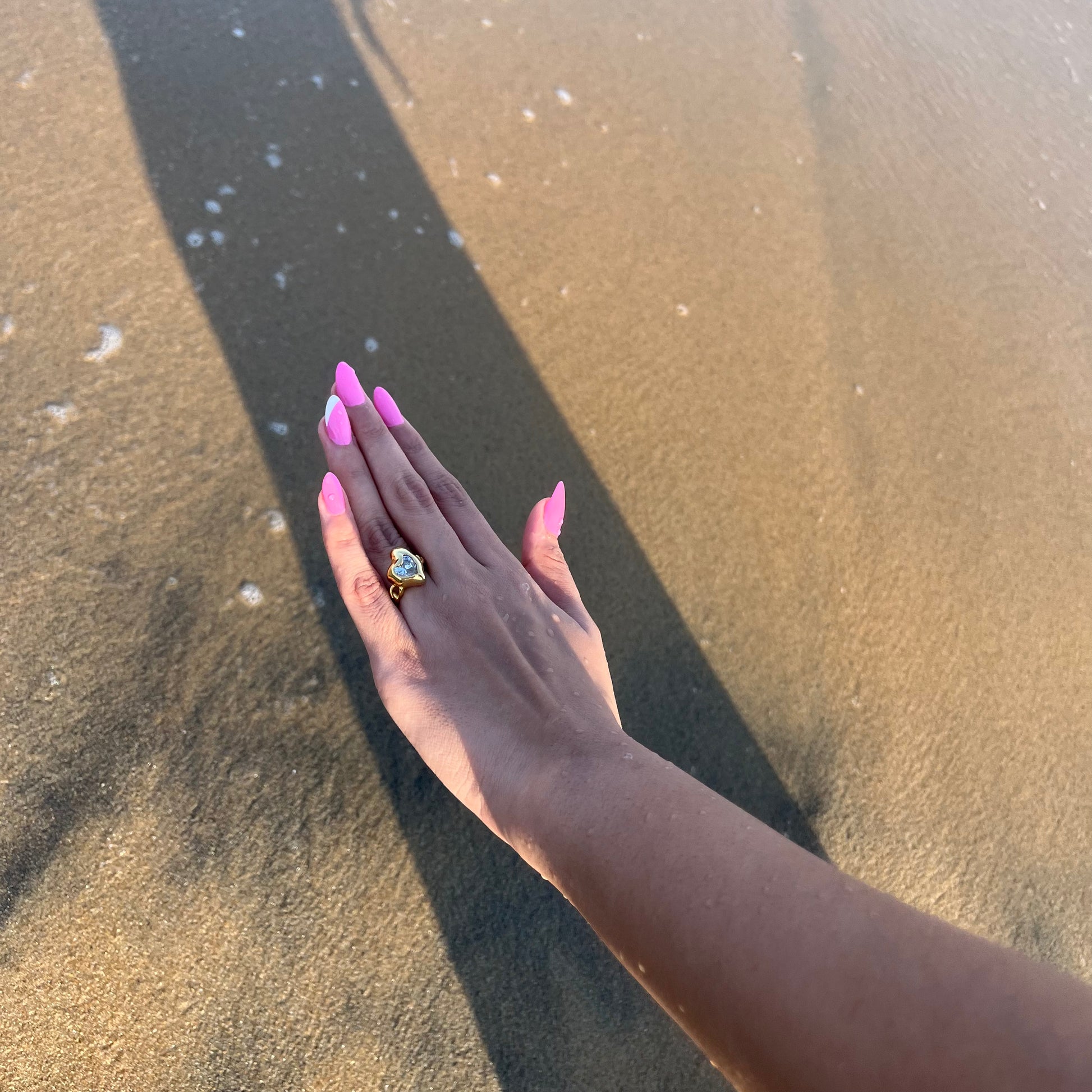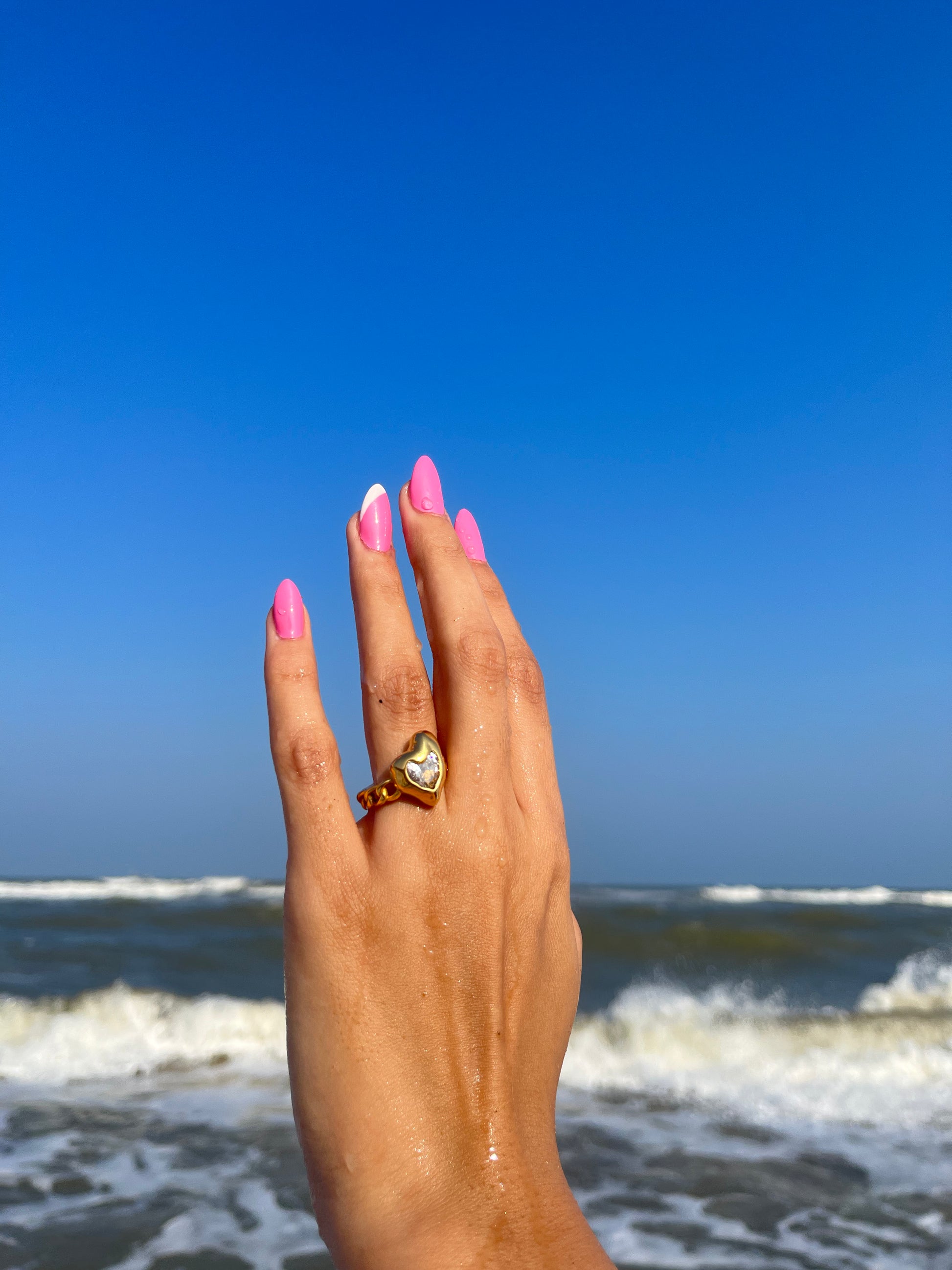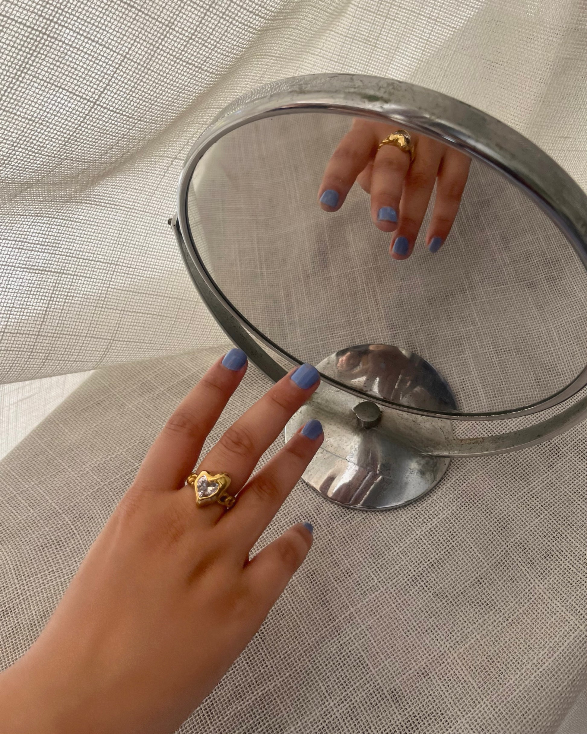 Pair it with soft tones, sheer fabrics, or other dainty gold rings for a look that’s sweet, subtle, and full of heart.