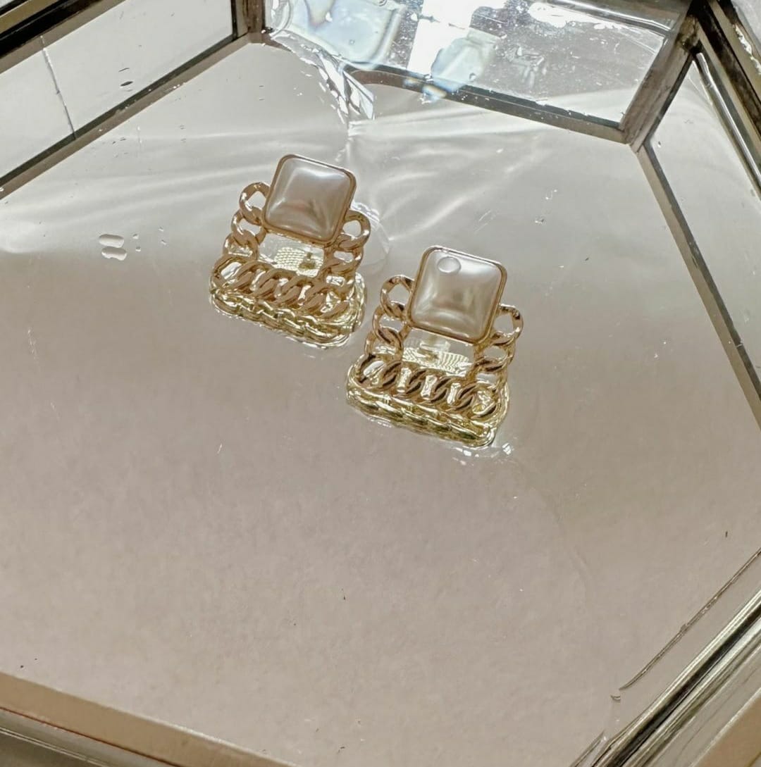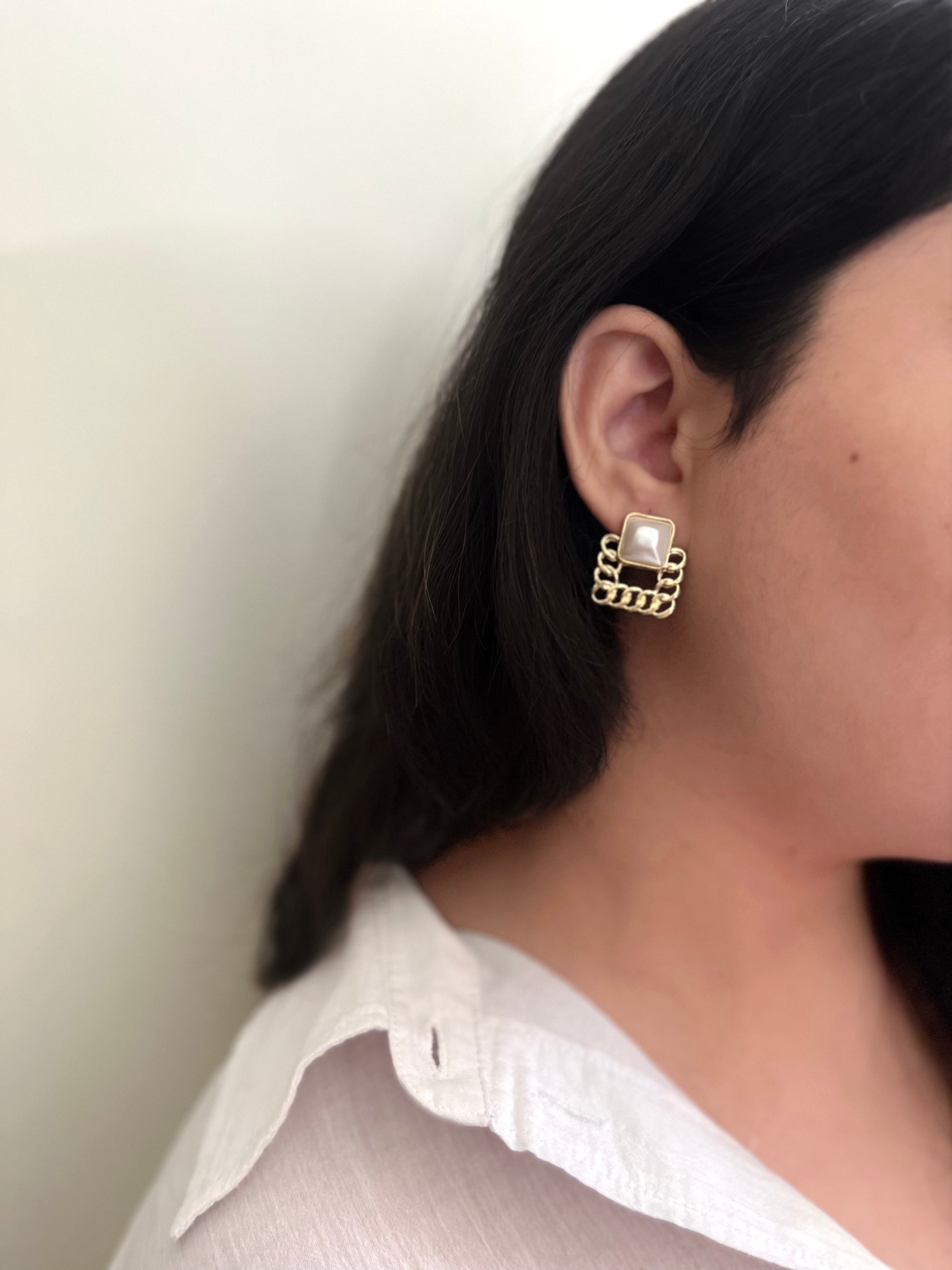 Our Chic Squared pearl studs rest on intricate gold chain detailing, giving them a bold yet delicate feel. A unique twist on a classic stud, perfect for elevating any look with effortless charm.