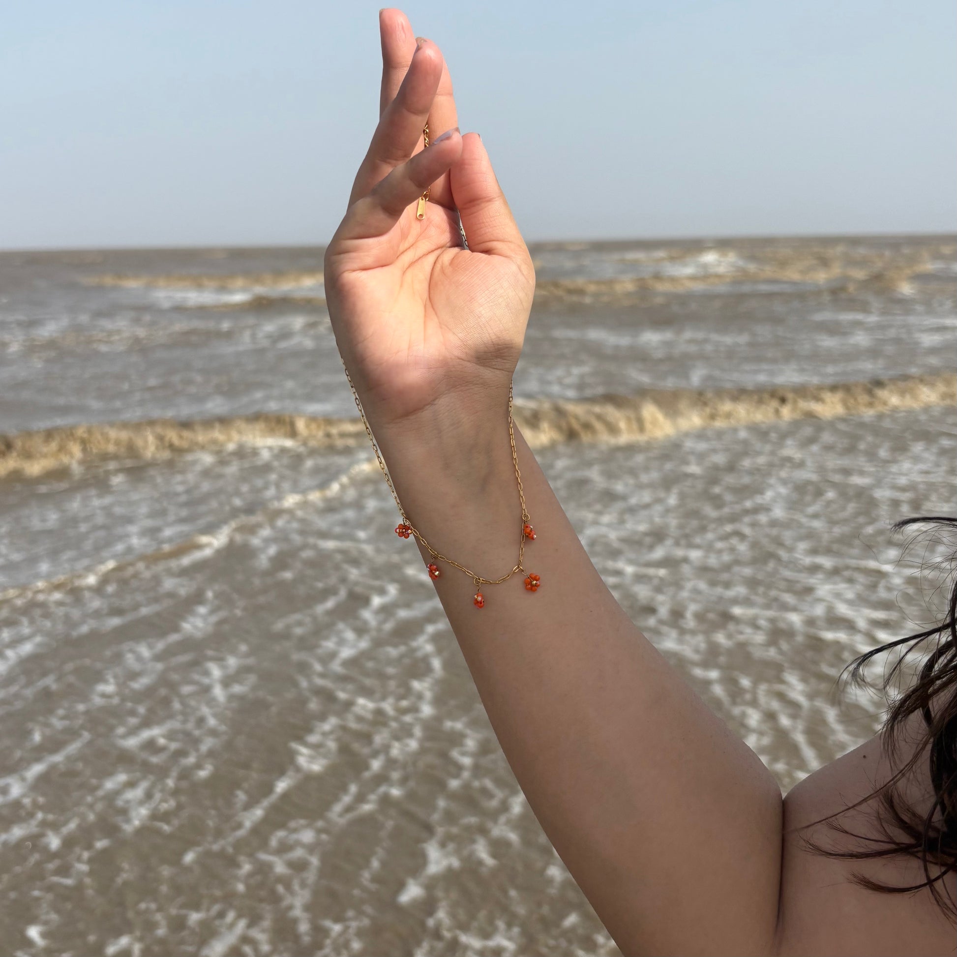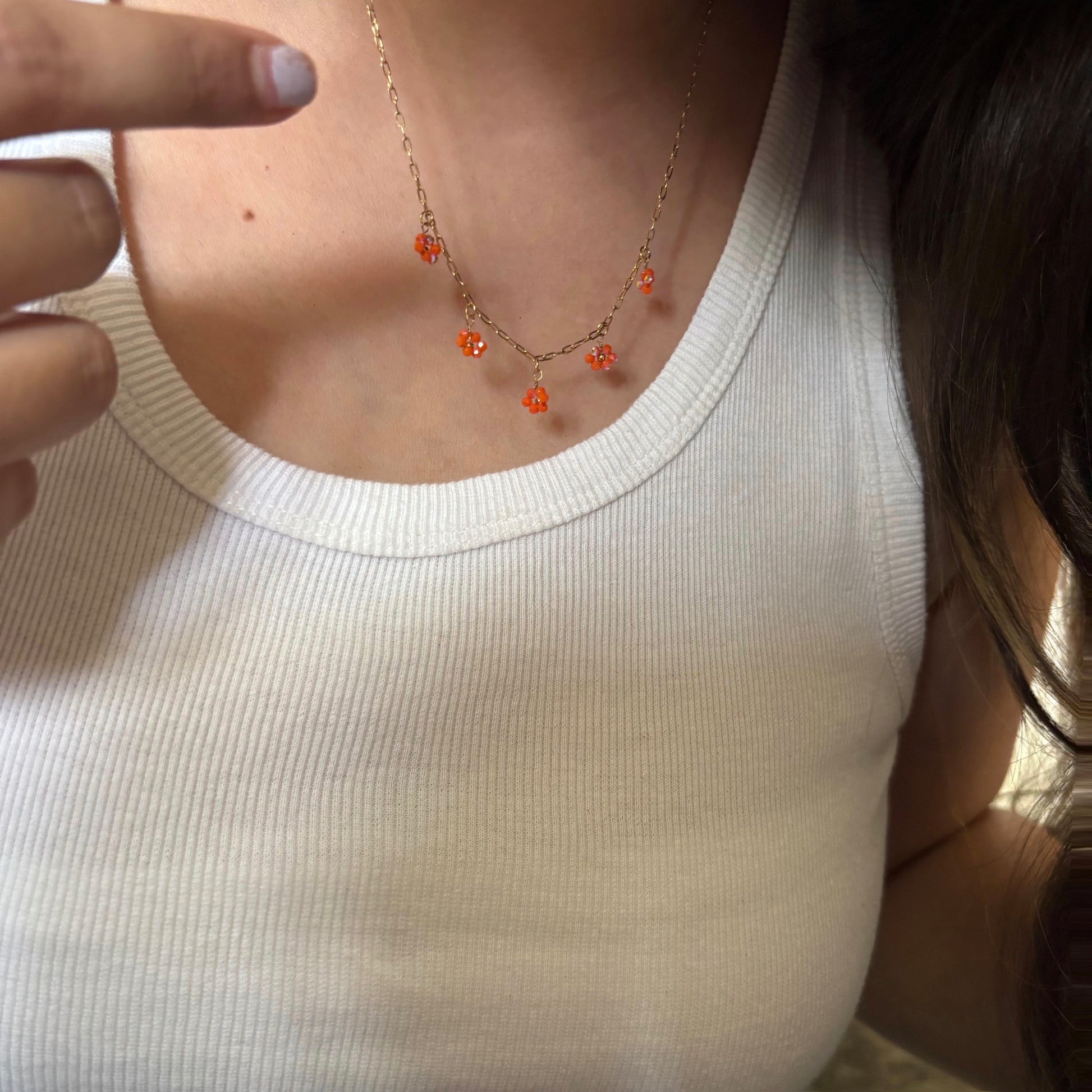 Our Coral Bloom neckpiece bursts with delicate flower accents in summery coral hues. Lighthearted and full of life, it’s your floral fix—no watering needed.