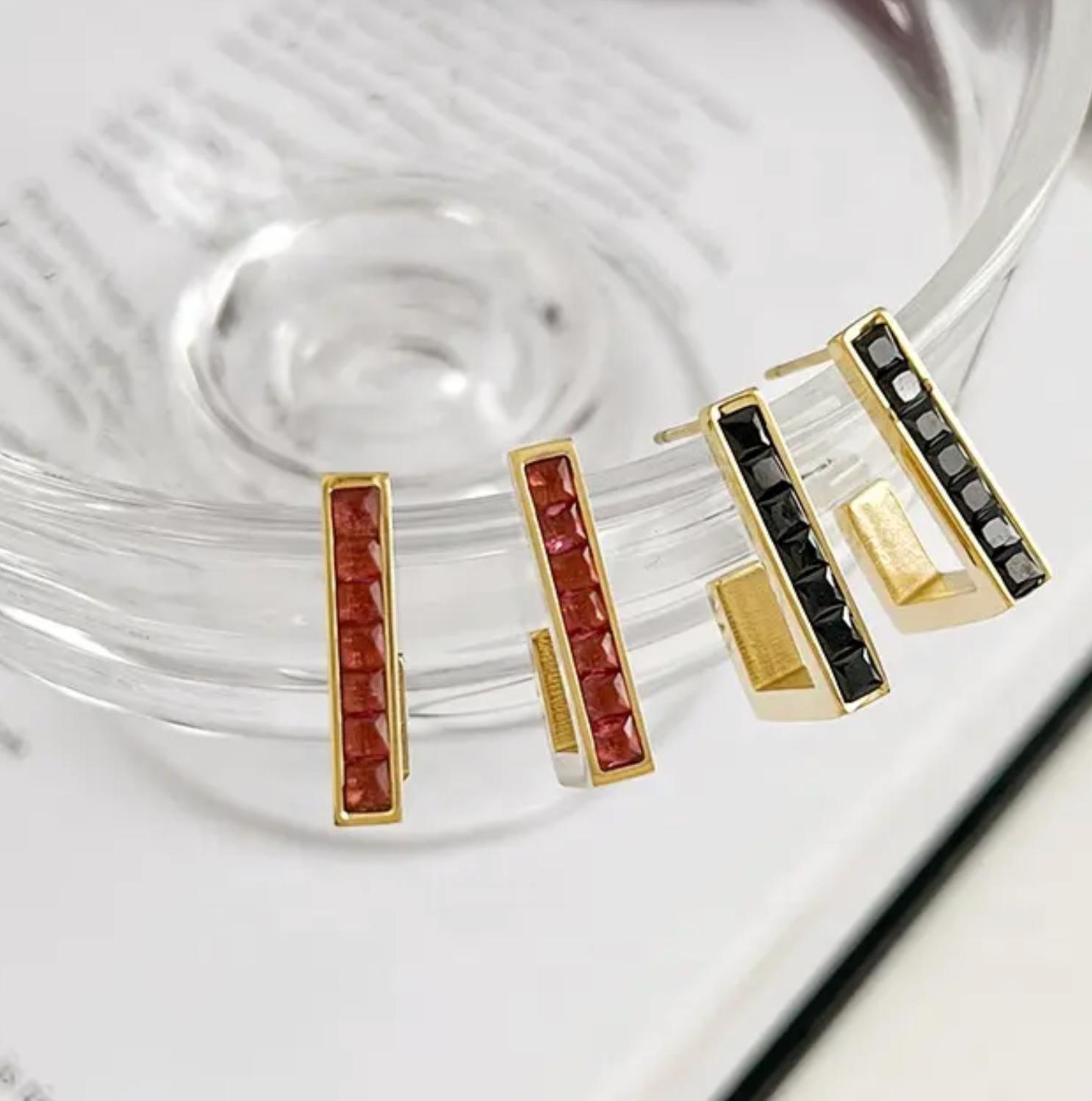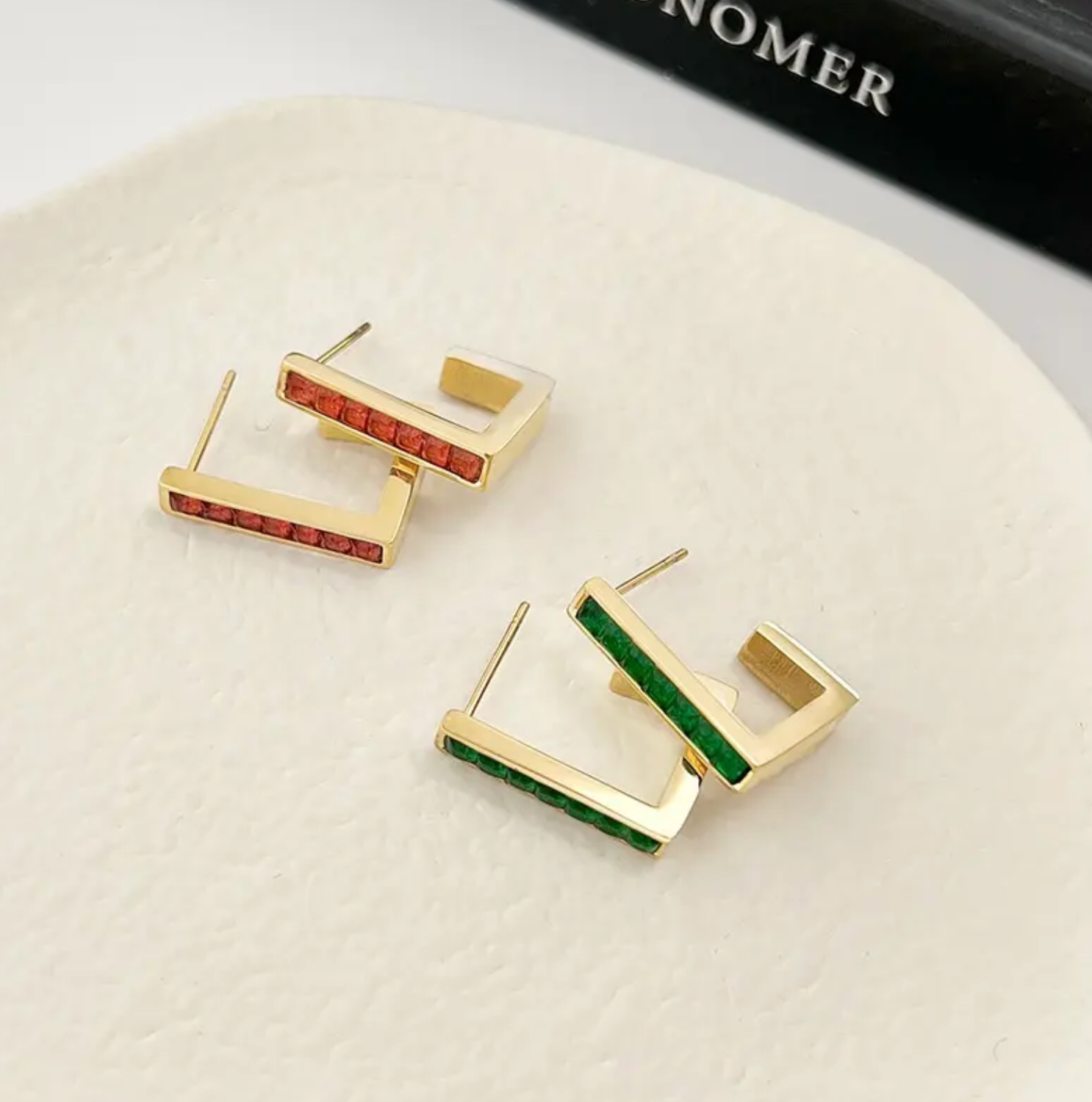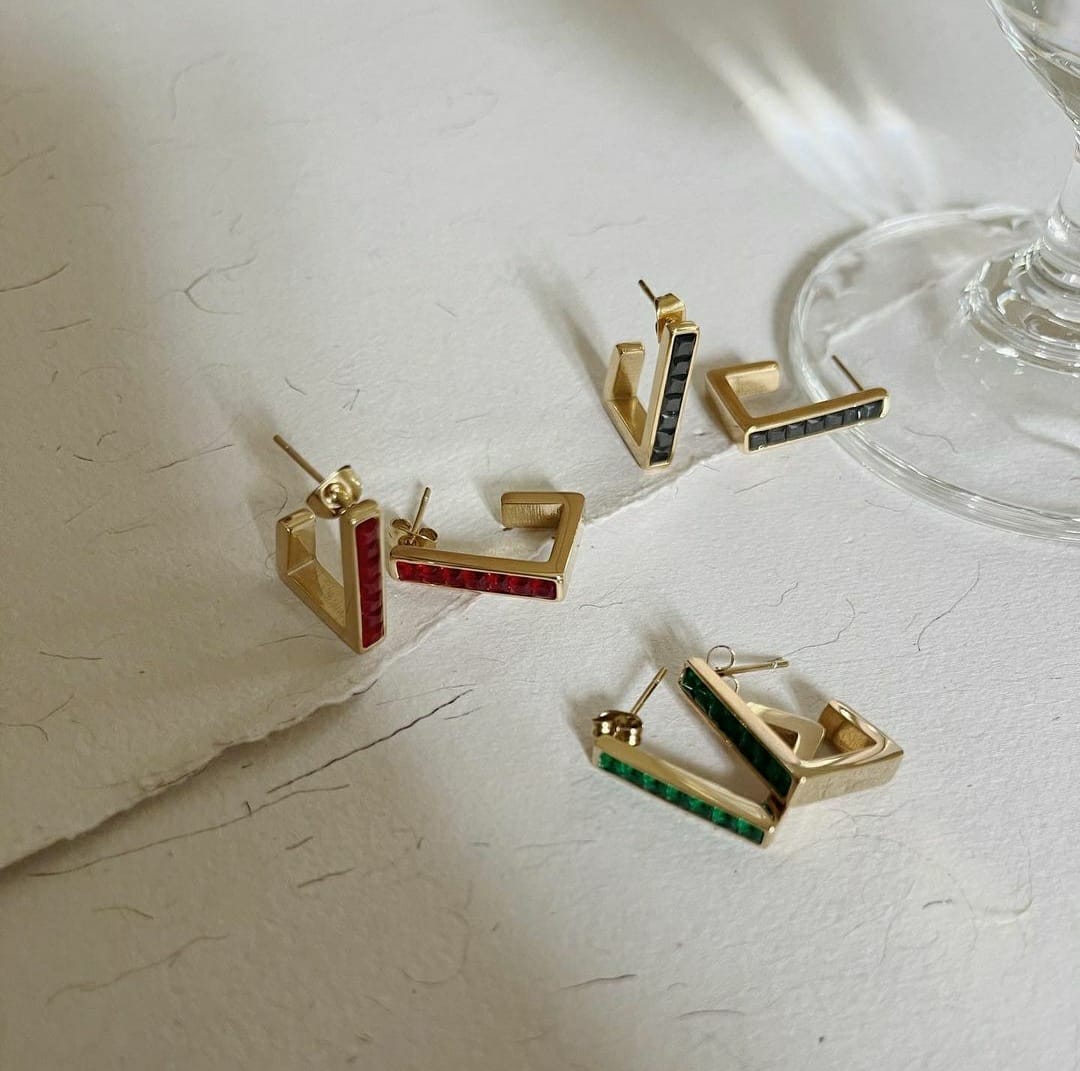 A bold fusion of geometric design and vibrant gemstones, the Half Squared Hues add a modern edge to any look. Set in radiant gold, each color brings its own unique charm—fiery red for confidence, deep green for elegance, and sleek black for effortless versatility.