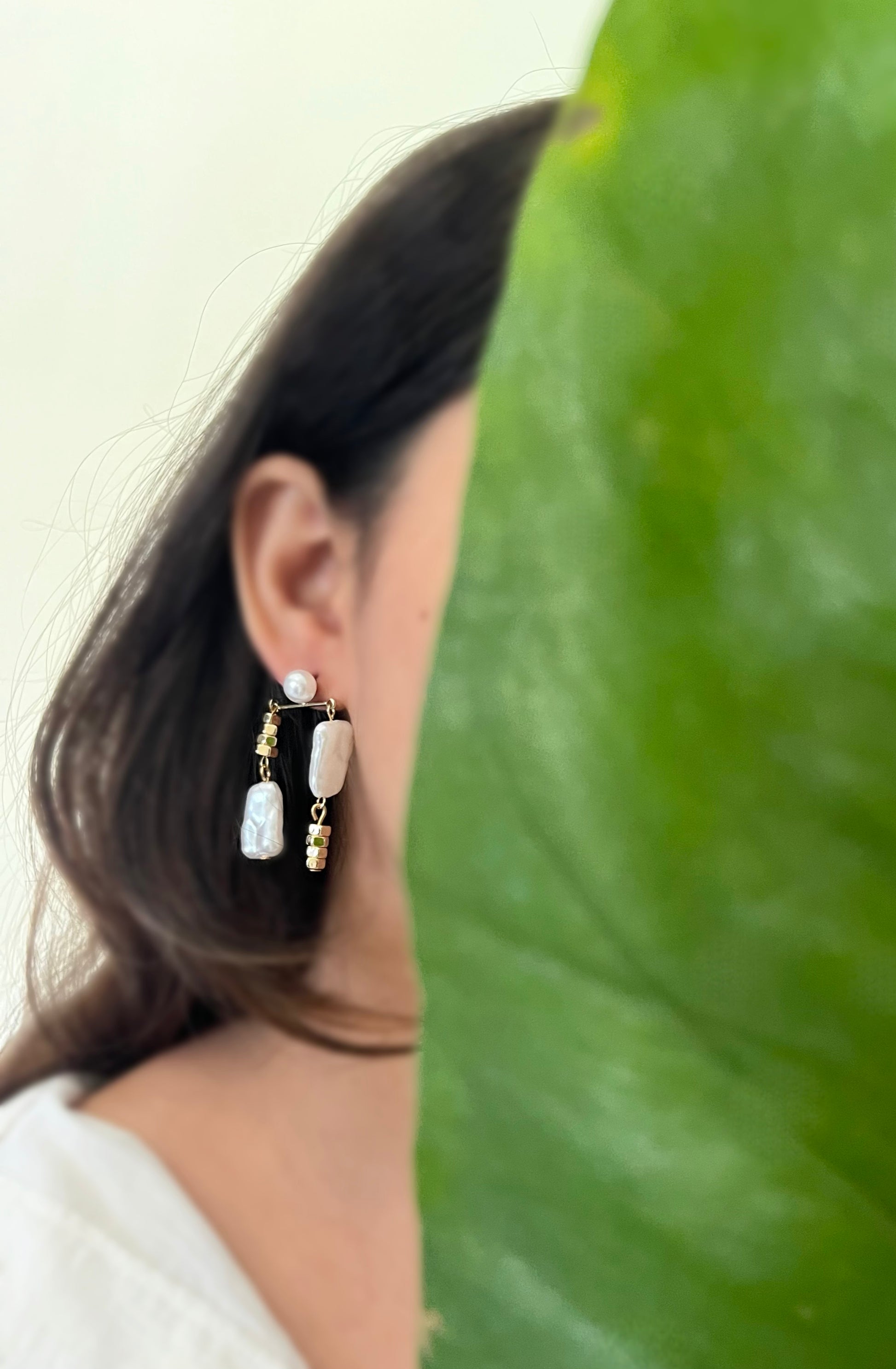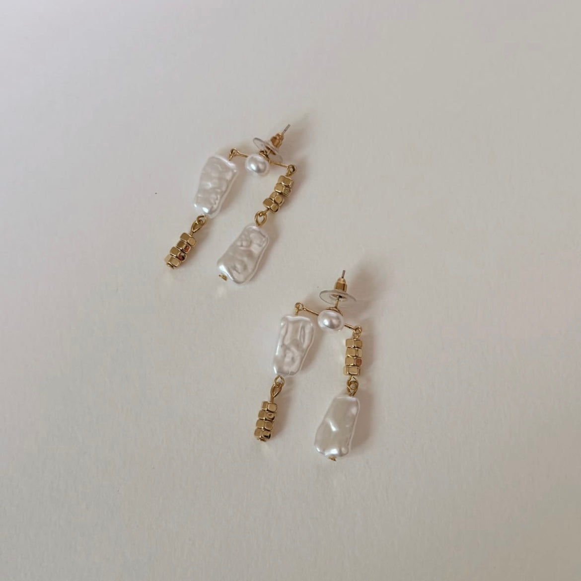 Elevate your look with the subtle sophistication of our Hanging Hyphens earrings. These delicate drops showcase the natural beauty of baroque pearls, each with its own unique shape and soft glow. Intricate gold-tone accents, resembling tiny hyphens, add a touch of modern detail, creating an elegant and refined accessory. Perfect for adding a touch of understated glamour to any occasion.
