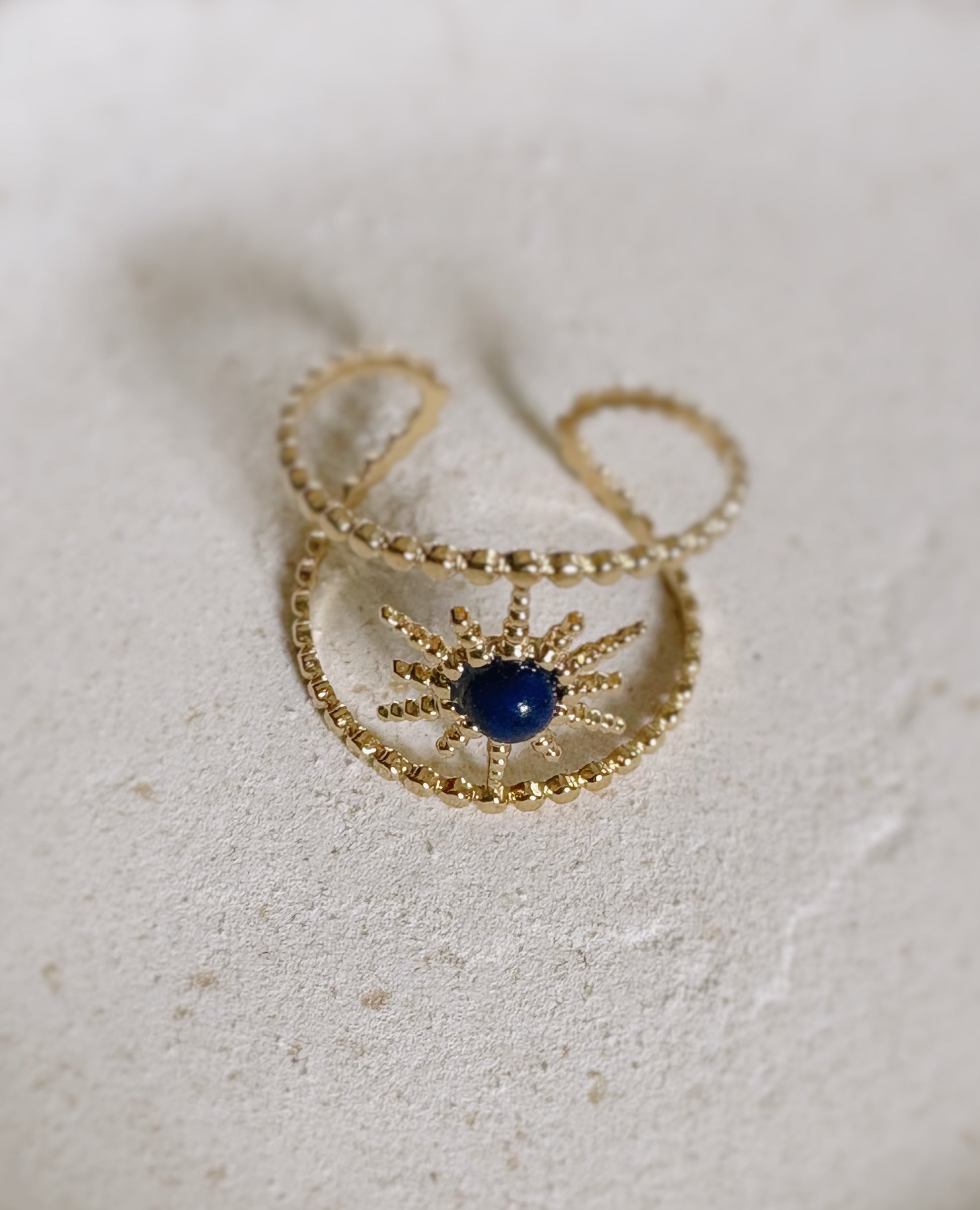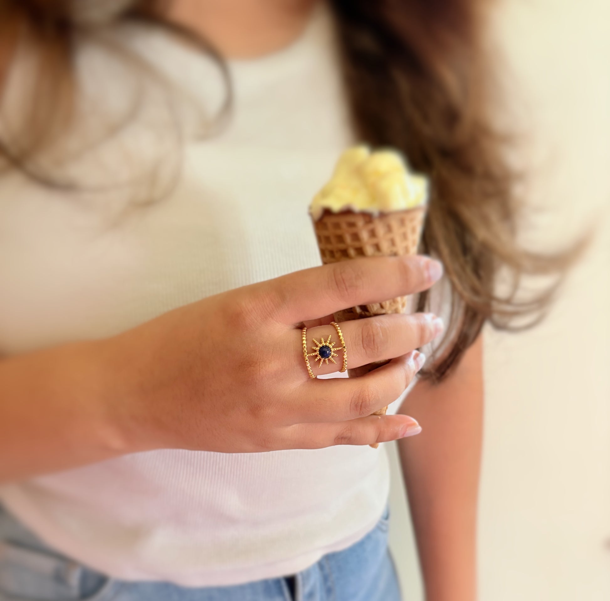 A burst of deep blue set in sun-drenched gold, this ring is made to turn heads and spark stories. Bold, bright, and unapologetically radiant.