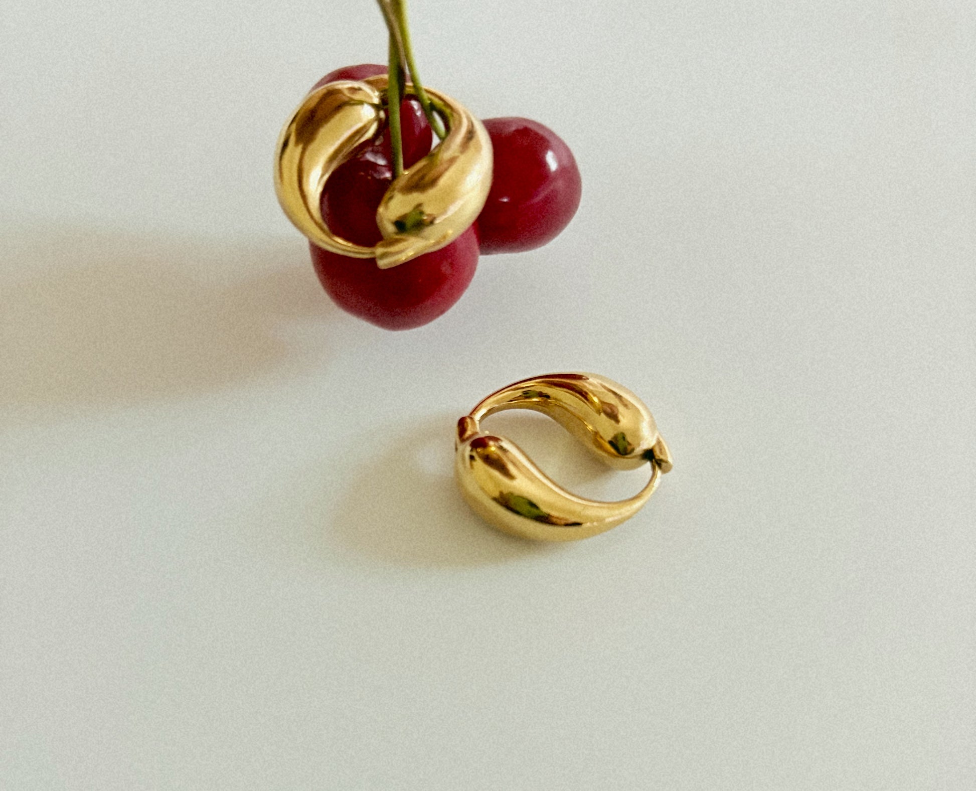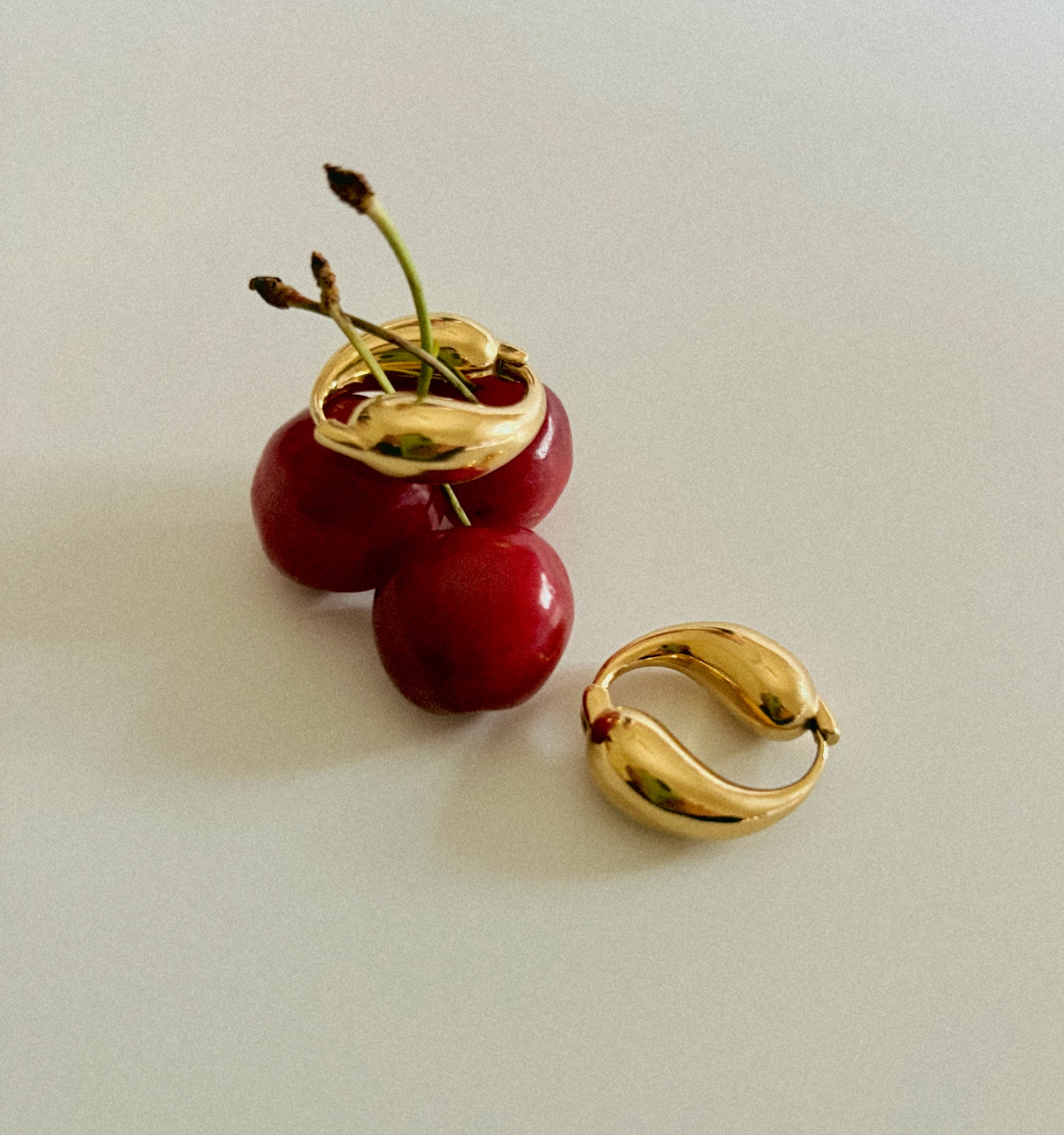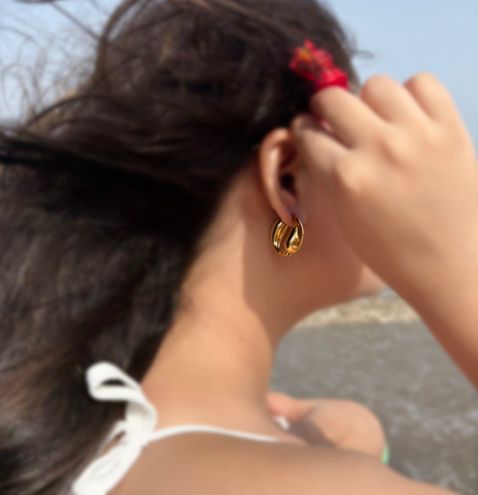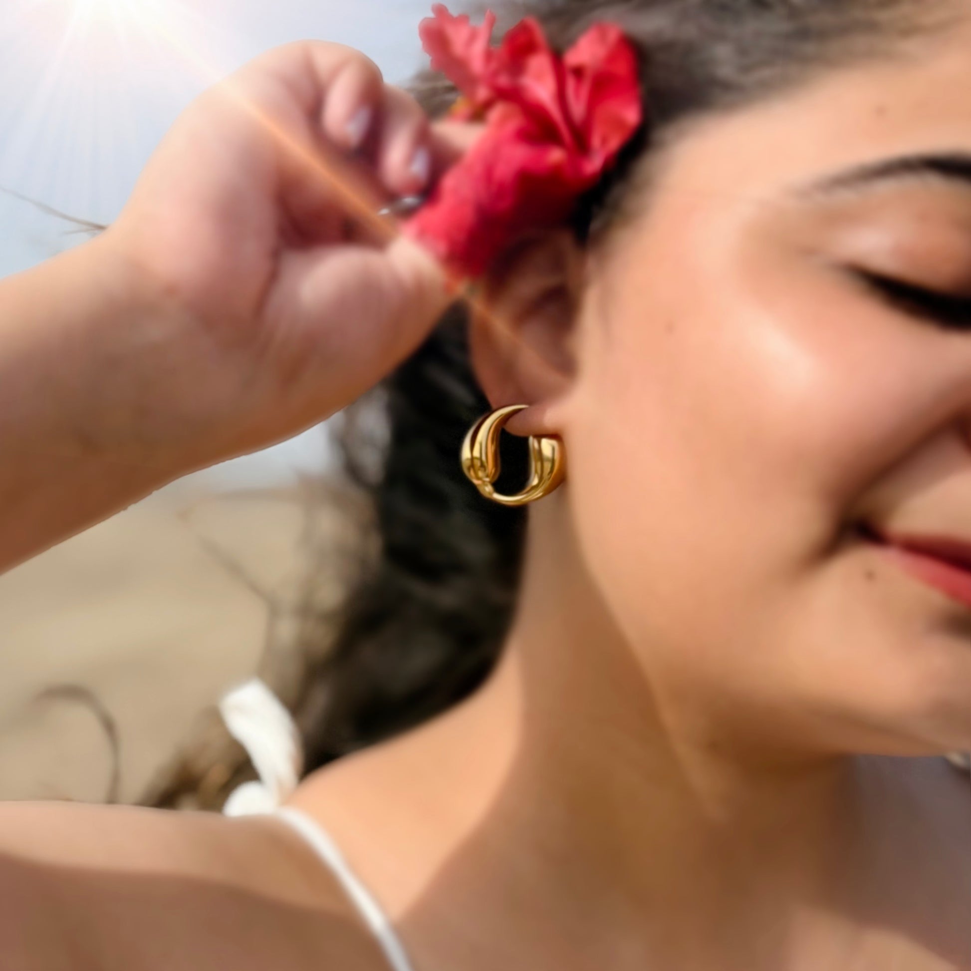 Meet our Cali Hoops—a pair of abstract, round-shaped golden earrings inspired by art, sun, and the laid-back luxe of California living. Unpredictable, just like you.