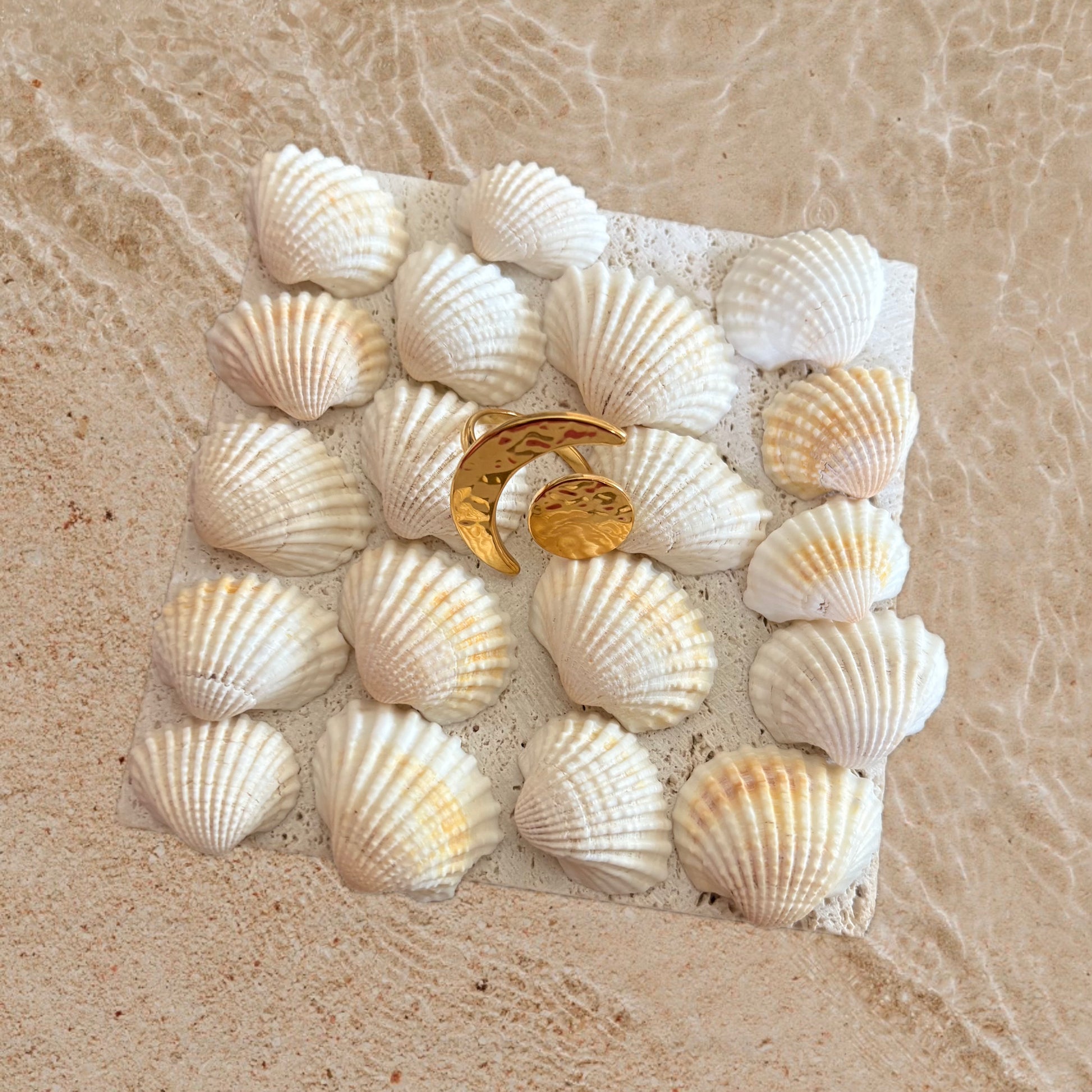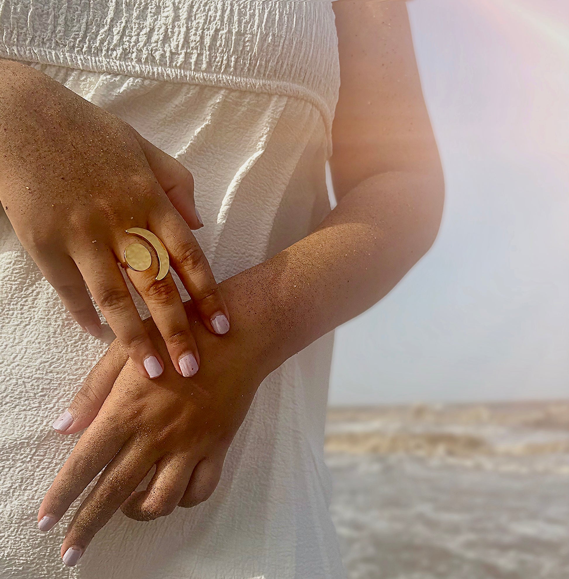 A celestial dance of gold and glow. This moon-kissed piece balances soft curves and lunar elegance, perfect for the stargazers and soul searchers.
