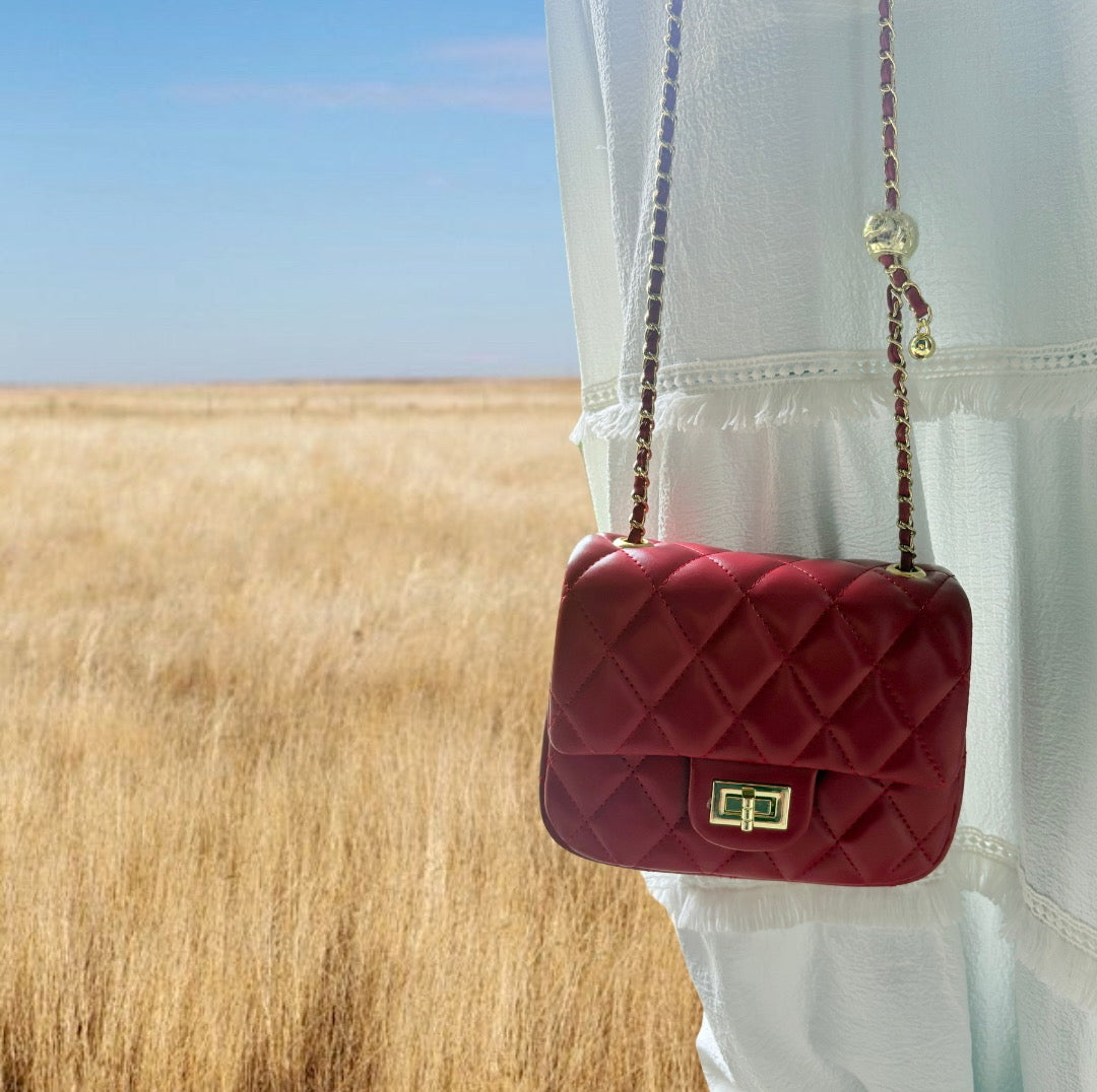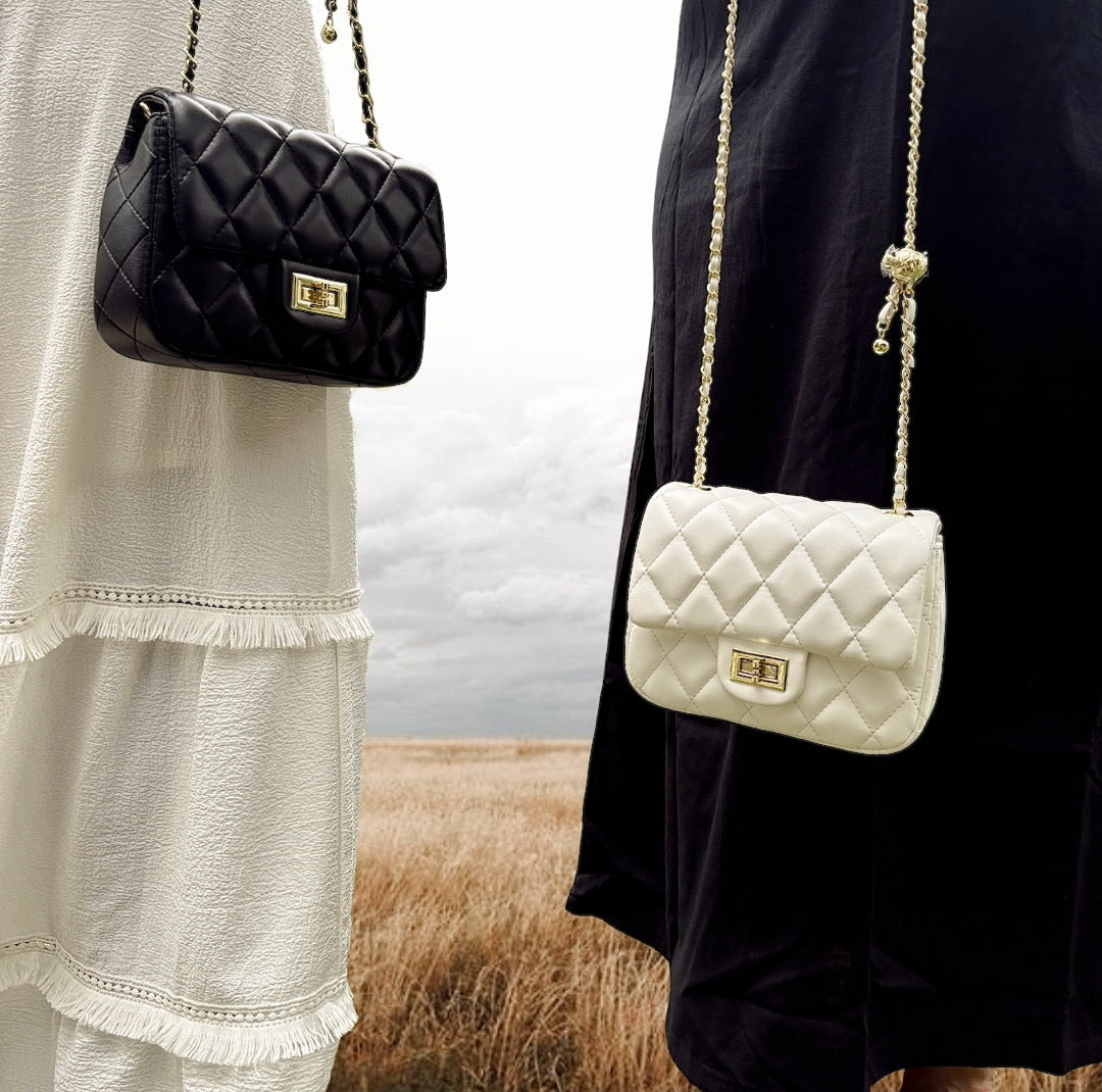 Two moods, one icon. Midnight & Moonlight are your go-to quilted minis for every vibe. Crafted in glossy faux leather with gold-toned chain straps and classic twist-locks, these shoulder bags are equal parts timeless and on-trend. Whether you’re dressing up for a dinner date or stepping out for errands, they carry your essentials — and your energy.