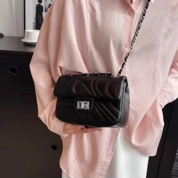Where timeless meets trend. The Noir & Neige Bag is your go-to for everyday elegance — crafted in soft quilted faux leather with a plush finish, a gleaming turn-lock clasp, and chain detailing that swings from day to night without skipping a beat.