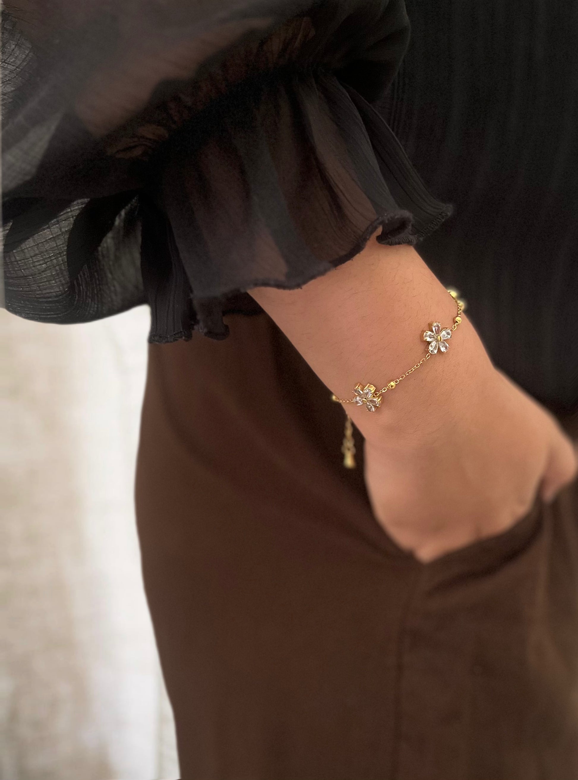 Soft, feminine, and effortlessly graceful—Roselle is a bracelet that blooms with every glance. Featuring delicate flower motifs paired with shimmering crystal accents, this piece captures the charm of a dew-kissed morning garden. It’s equal parts dainty and divine.