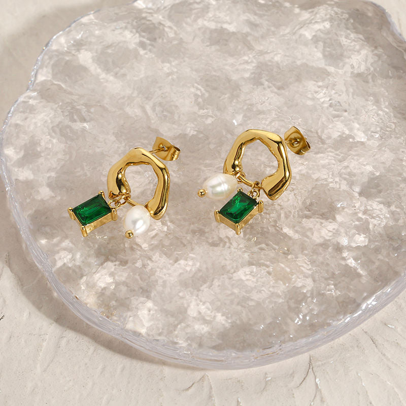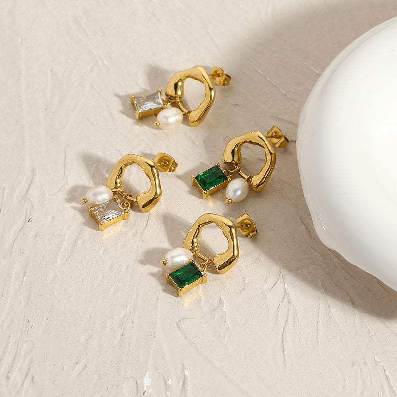 Itβs giving structure with softness. Soft Girl Geometry is a pair of drop hoops featuring a clean-cut square charm β in emerald or transparent β paired with a delicate pearl drop. Bold angles meet gentle details for the kind of balance that makes every outfit feel just right.