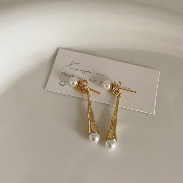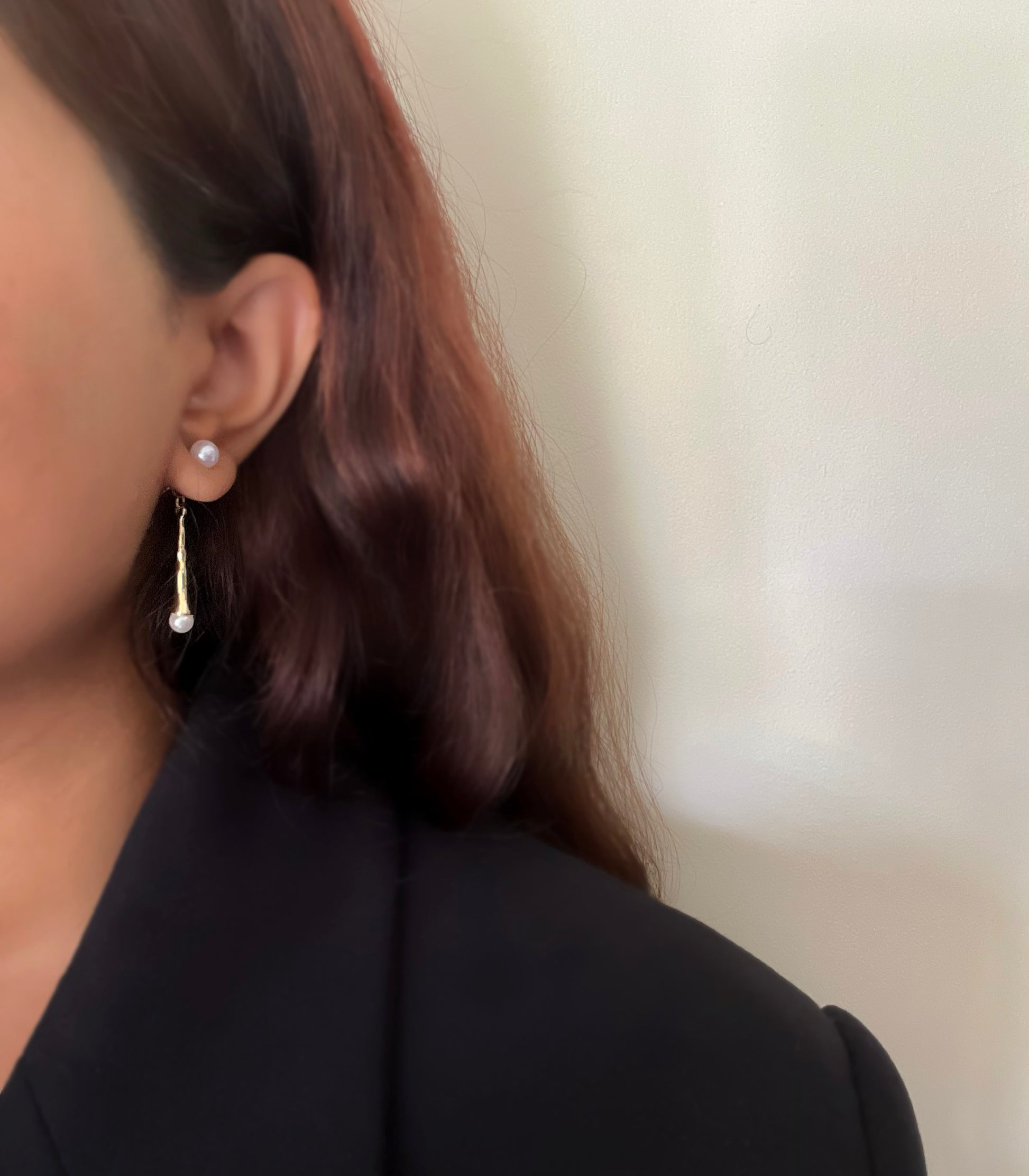 Dainty yet full of character, these pearl drop earrings are for the ones who move with ease and elegance. The elongated golden structure meets soft pearls for a look that’s both sophisticated and playful—perfect for those who love an understated statement.