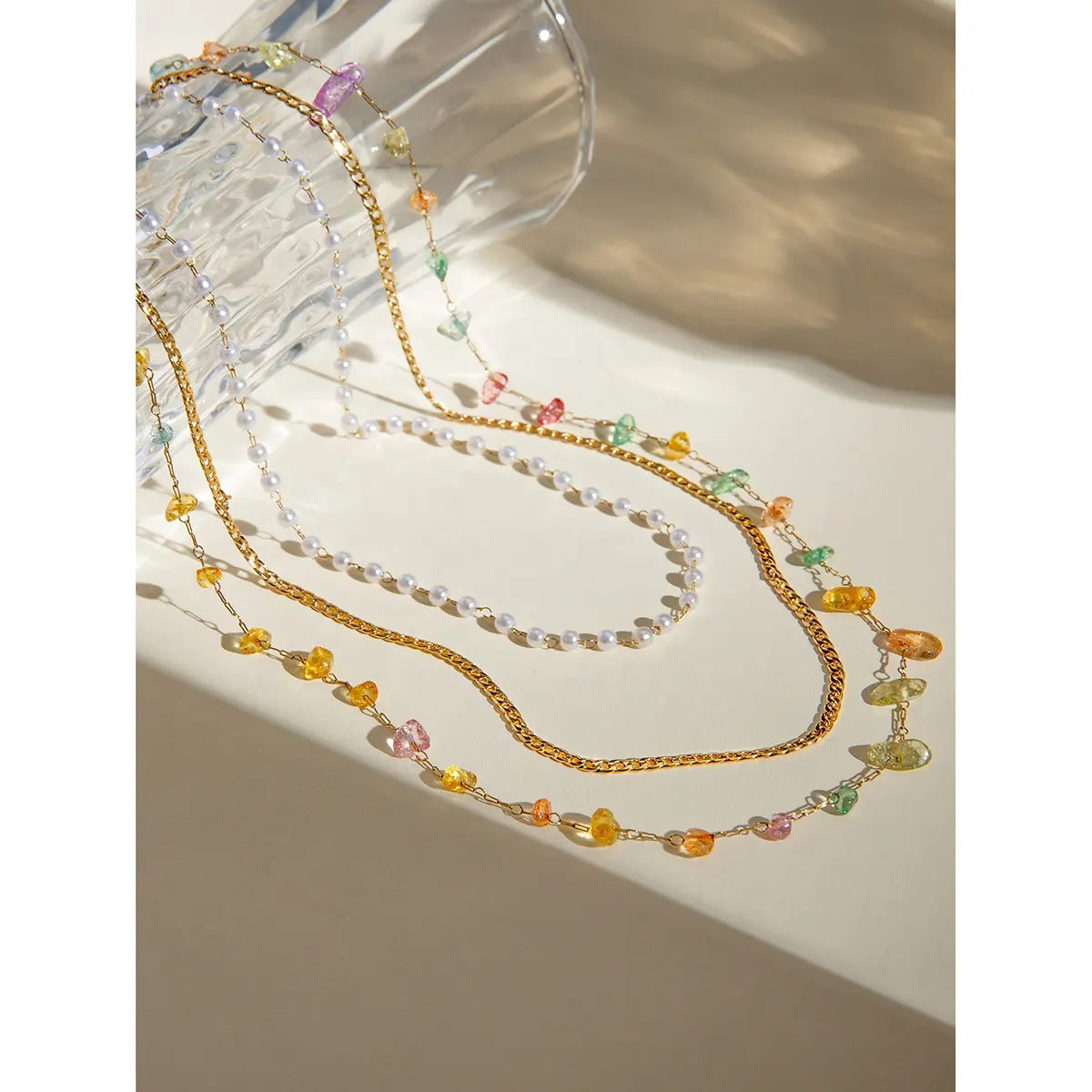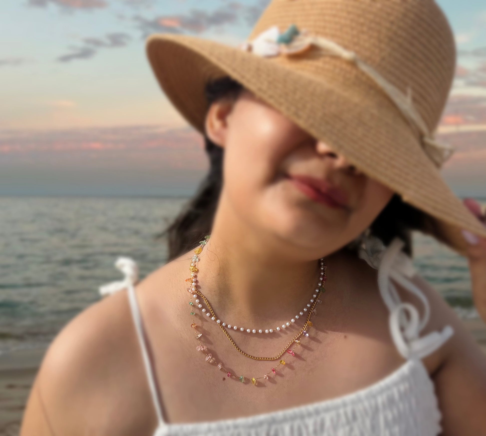 Our pastel beads neckpiece, paired with an elegant pearl layer and a soft golden chain, feels like bottled sunshine. Light, playful, and quietly luxurious—The Summer I Glowed is made for golden hour moments, breezy brunches, and everything in between.